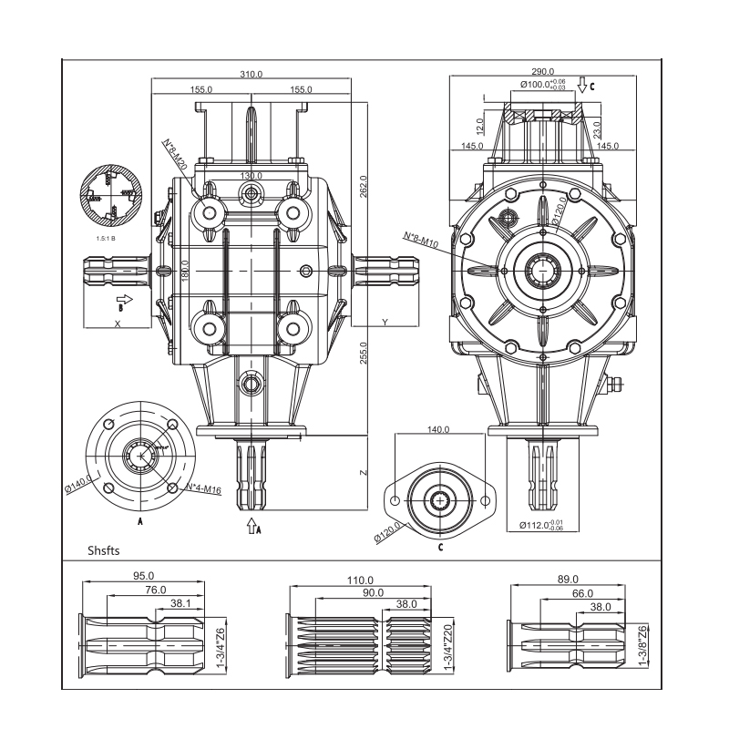 KLF-GC290-B oferă o varietate de raporturi de transmisie, adaptabile la o gamă largă de diferite tipuri de echipamente de utilaje agricole, inclusiv concasoare de paie și mașini de reciclare a filmelor agricole. Angrenajele Gleason Bevel sunt fabricate cu o precizie ridicată, asigurând o precizie ridicată a ochiurilor de plasă, pierderi minime de transmisie și eficiență ridicată în transferul de energie. Produsul este proiectat cu un mecanism de ambreiaj unic. În timpul funcționării, când arborele de tăiere funcționează cu viteză mare, dacă tractorul oprește brusc intrarea de putere, inerția arborelui tăietor poate fi prea mare. Ambreiajul unidirecțional protejează efectiv angrenajele și arborele de daune din cauza acestei opriri bruște.
